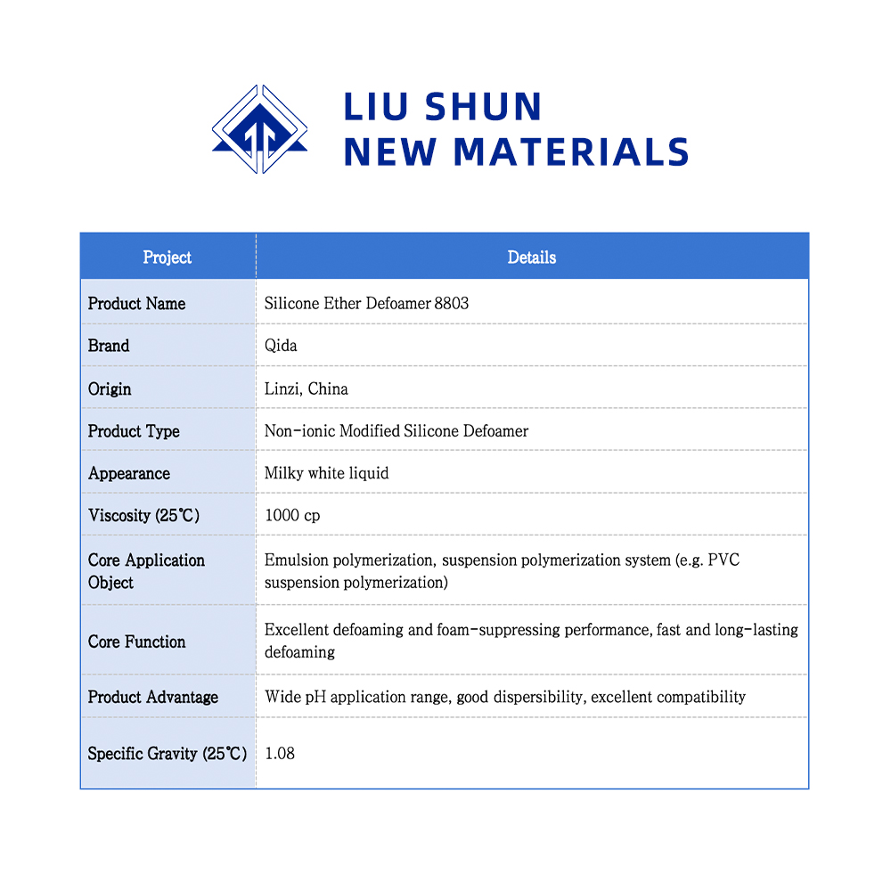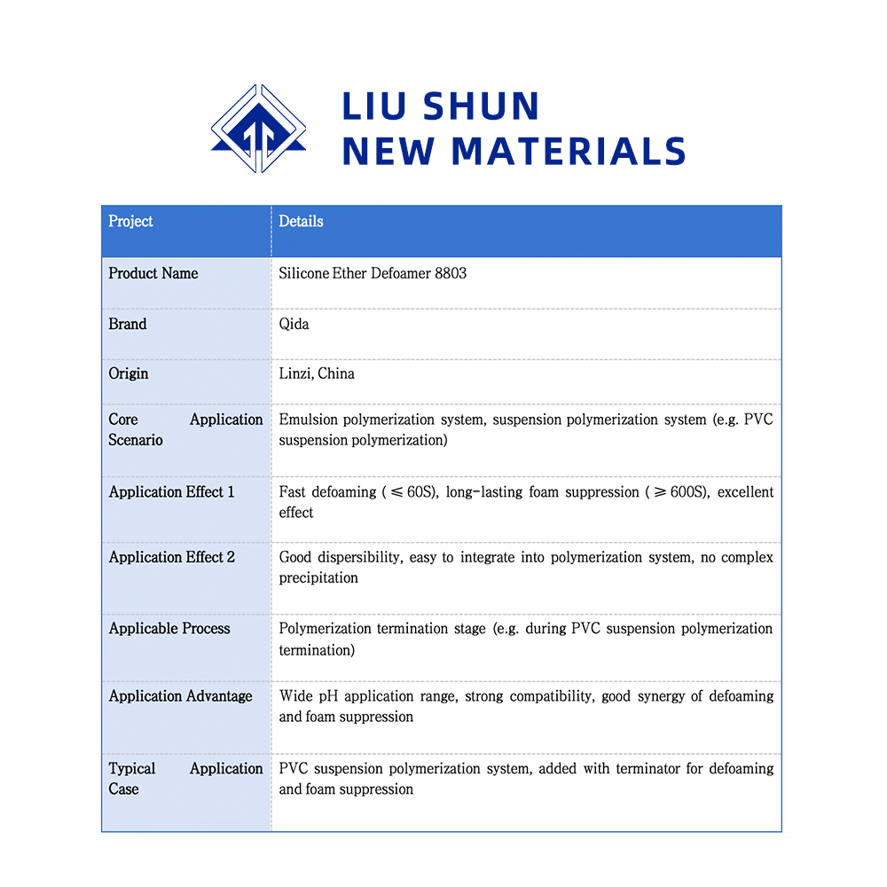 As a non-ionic defoaming agent, 8802 exhibits exceptional compatibility with cationic and anionic surfactants as well as polymer systems, without forming complex precipitates. For instance, during polyvinyl chloride suspension polymerization, it can be added to the system either alongside the terminator or pre-added to the terminator before termination.
