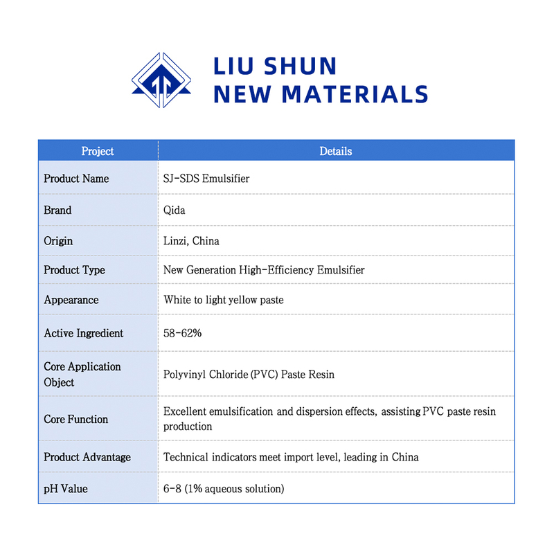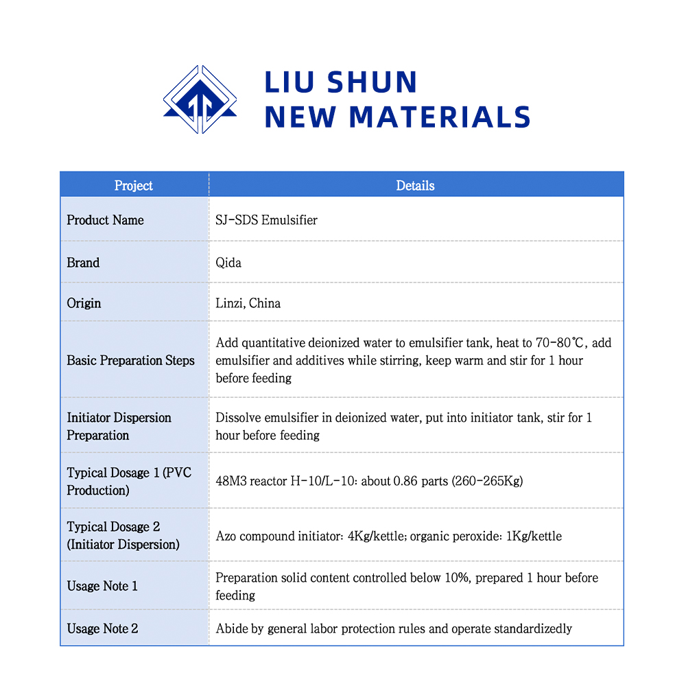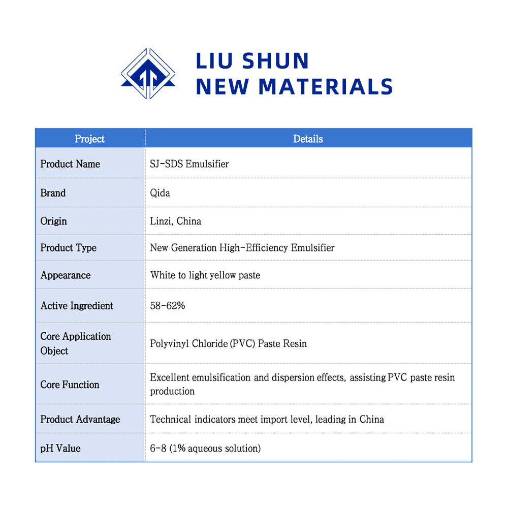 SJ-SDS is a new-generation high-efficiency emulsifier with excellent emulsification and dispersion performance. It is widely used in the production process of PVC paste resin, where its technical specifications match or even surpass those of imported products. Currently, it stands as the most advanced emulsifier for PVC paste resin in China.
