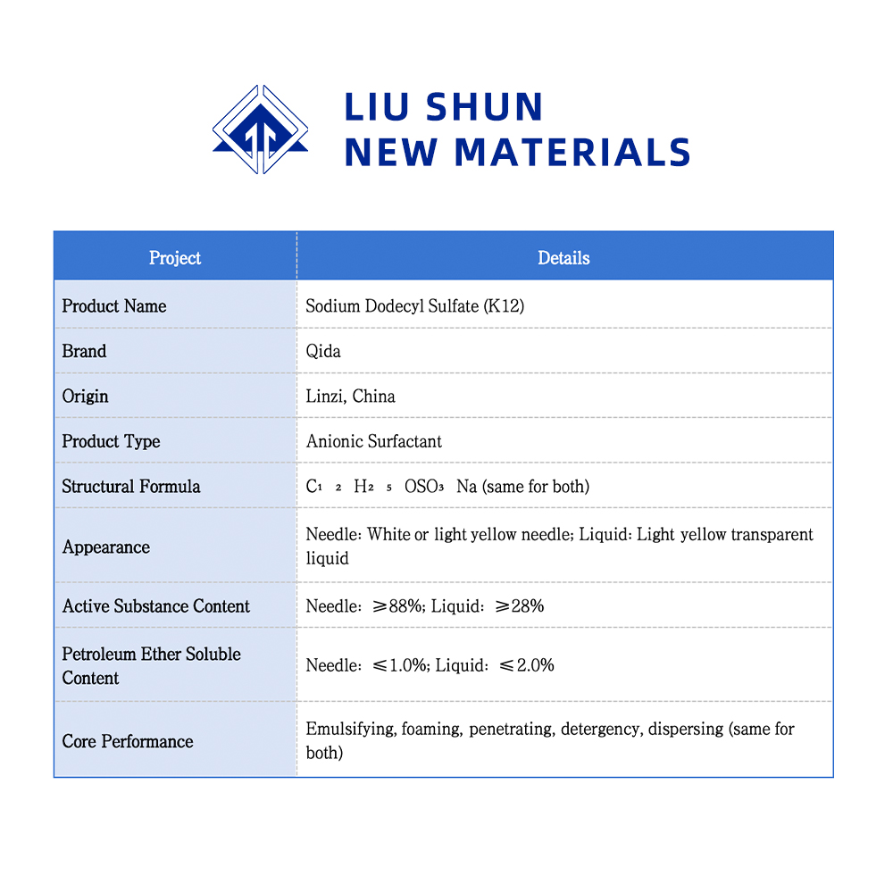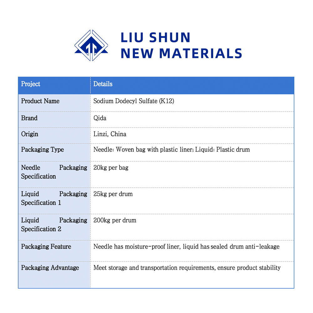 This anionic surfactant exhibits excellent emulsifying, foaming, penetrating, cleaning, and dispersing properties, with abundant foam, good compatibility, and rapid biodegradation. It is widely used in detergents, emulsification, and polymerization processes. Packaging: Needle-shaped products are packaged in 20kg woven bags with inner plastic lining. Liquid products are available in 25kg or 200kg plastic drums. Storage and transportation: Handle with care during handling, store in cool, dry, and well-ventilated warehouses, and keep away from corrosive substances. Bagged products should be placed on elevated ground to prevent rain and moisture exposure.