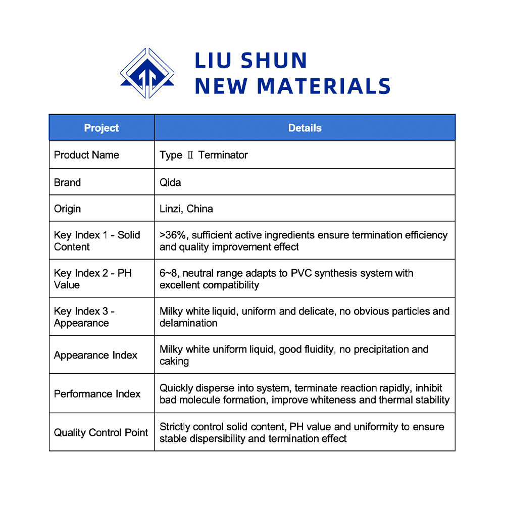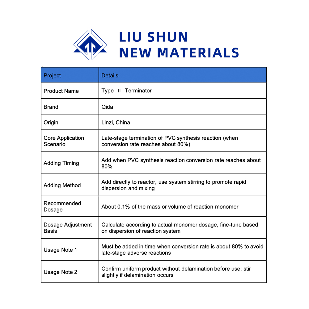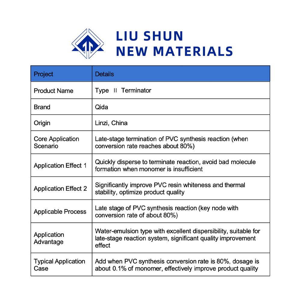 Home » Products » Terminator » Type-II Terminator for Late PVC Polymerization Add at 80% Conversion Improve Resin Quality Rapid Dispersion