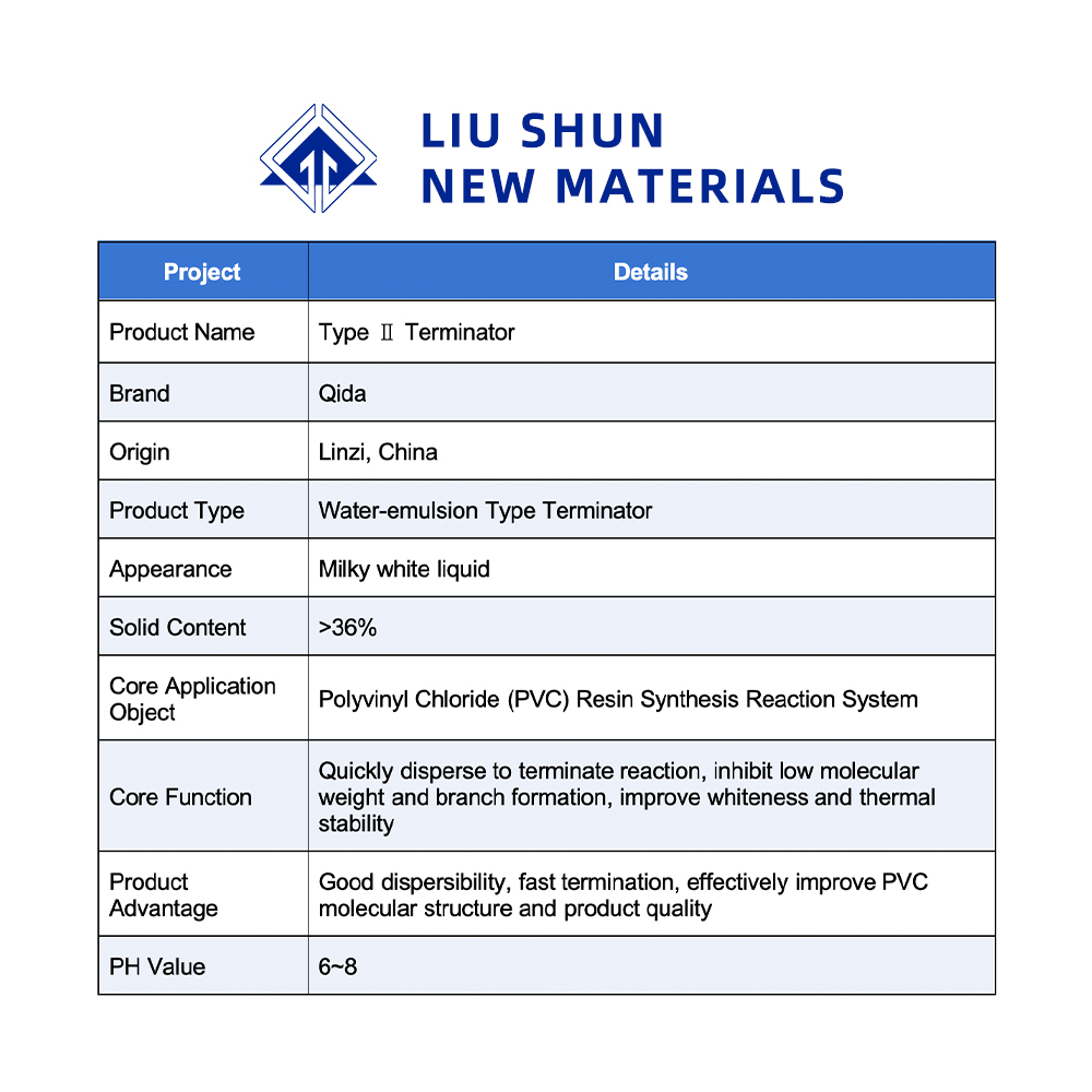 In the late stage of PVC polymerization, the decrease of monomer content tends to produce low molecular weight PVC molecules and increase of side chains, which affects the quality of PVC. Therefore, a terminator is needed to terminate the reaction. Type Ⅱ water-emulsion terminator can be dispersed into the reaction system quickly and terminate the reaction rapidly, and can significantly improve the whiteness and thermal stability of PVC.