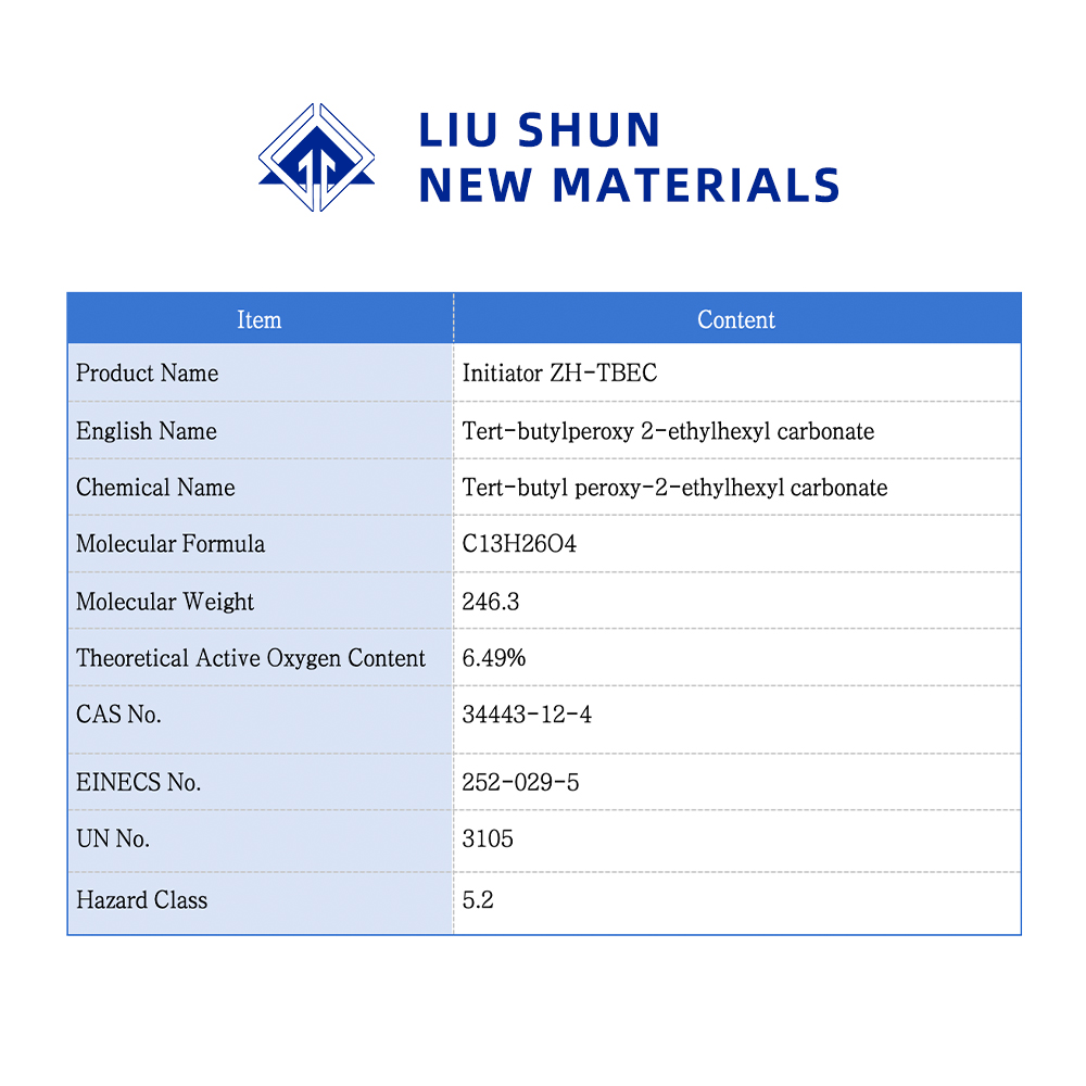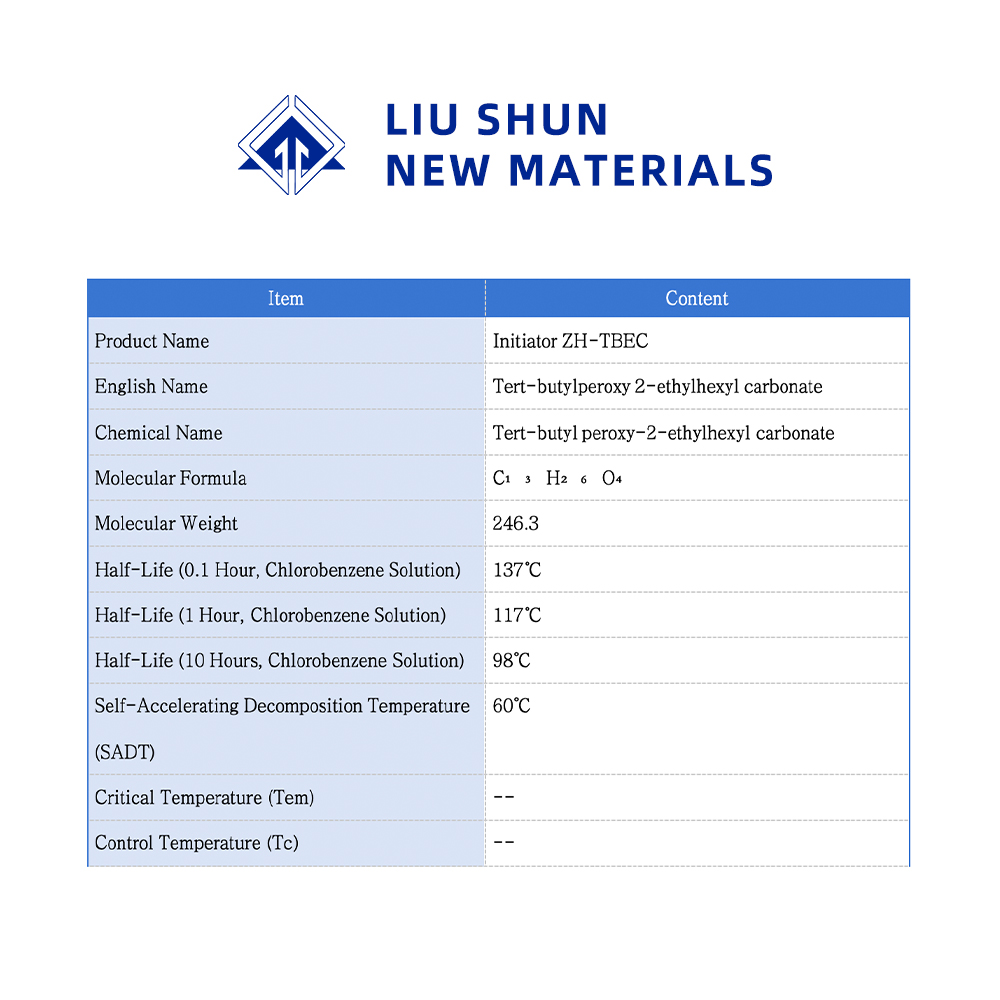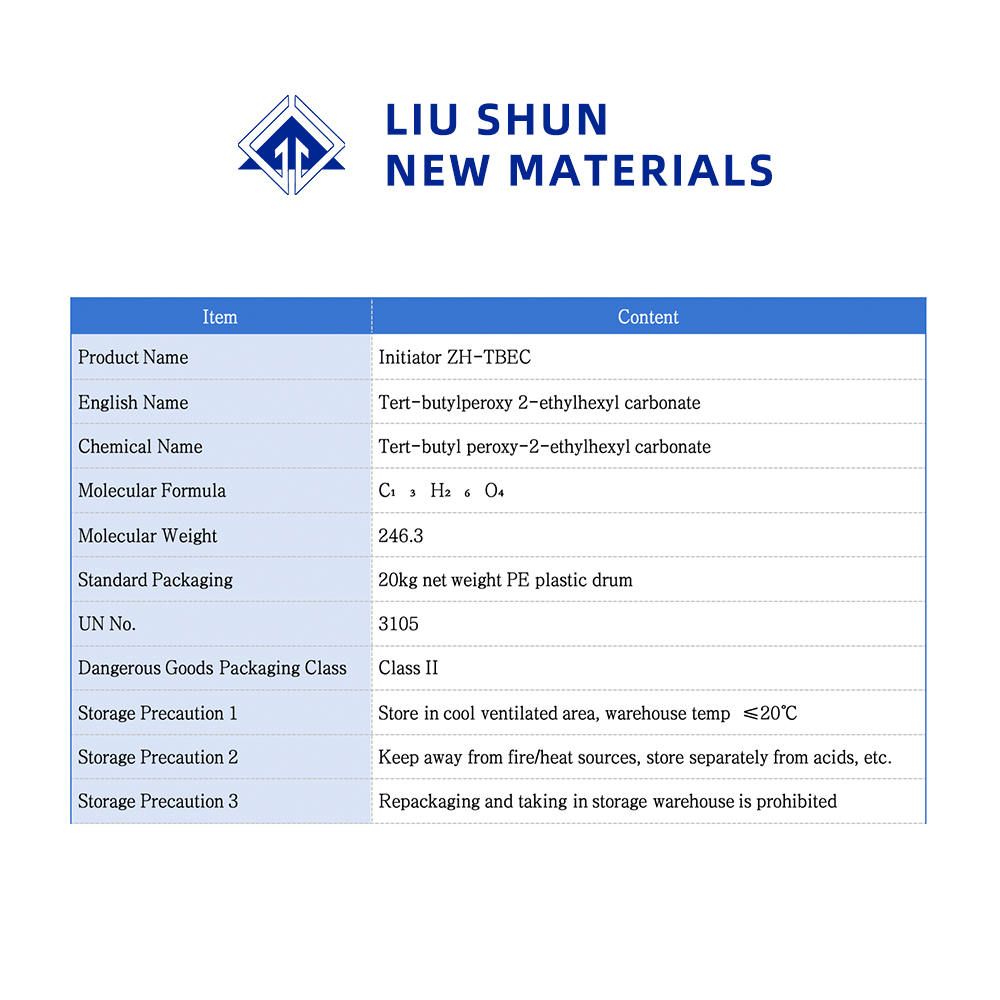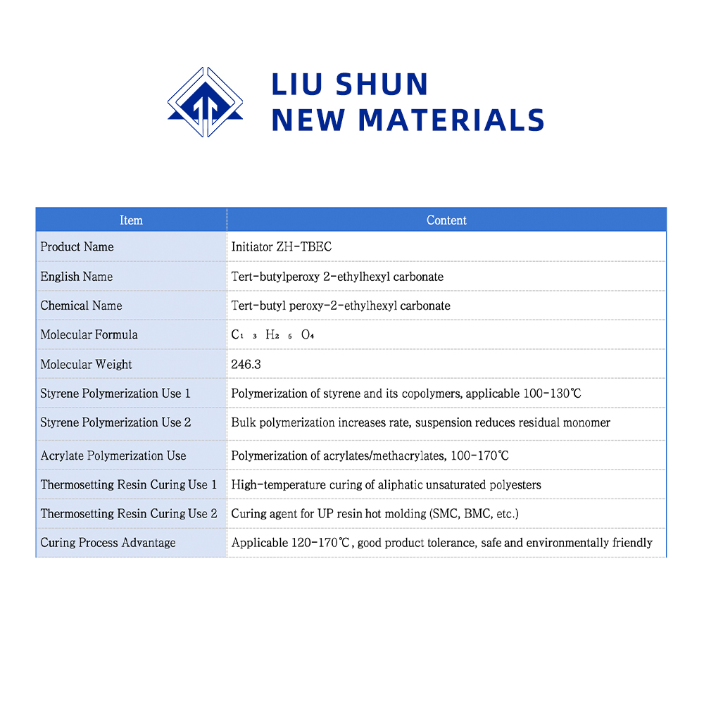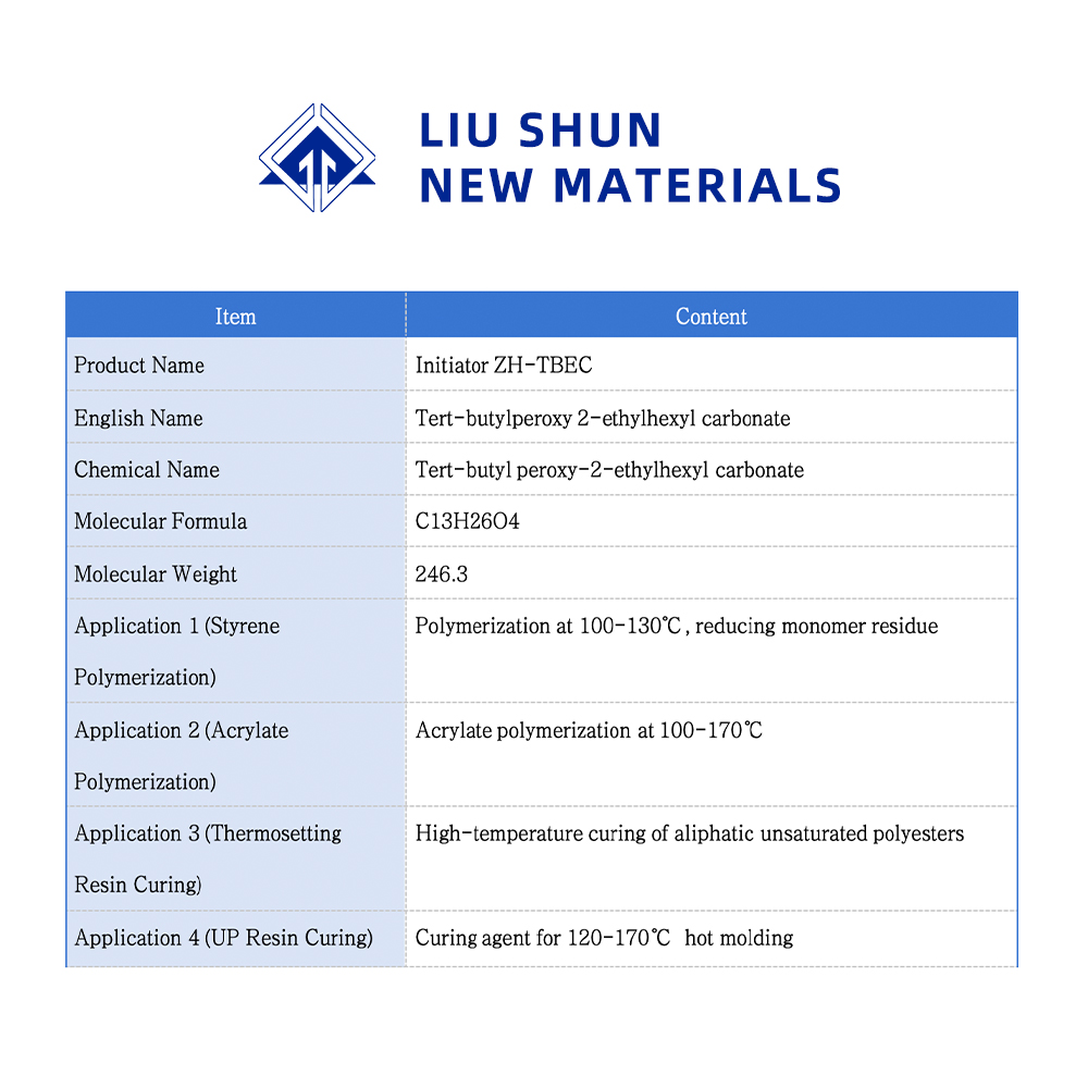 TBEC is the curing agent for UP resin hot molding process (SMC, BMC, ZMC, etc.), the temperature range of 120-170 ℃, the products are resistant to